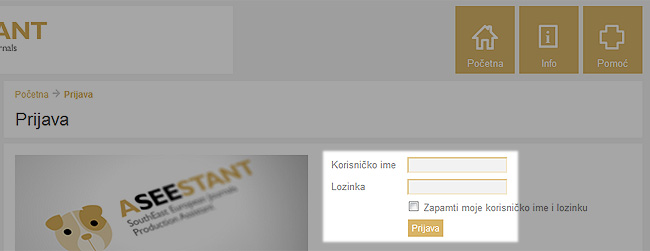 а) На интернет адреси aseestant.ceon.rs/index.php/sabornost унети Корисничко име и Лозинку и кликнути на поље Пријава.